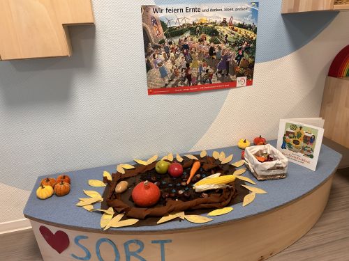 Zu Erntedank wurden die Familien zu einer Wortgottesfeier auf dem Außengelände eingeladen. Bei schönstem Herbstwetter wurde gemeinsam gesungen, gebetet und erzählt. Anschließend gab es für alle eine wärmende Kartoffelsuppe.